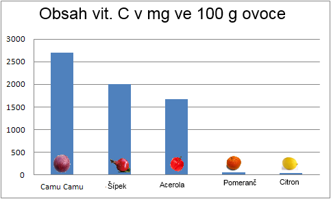 Porovnání obsahu vitamínu C v jeho přírodních zdrojích. Camu Camu jednoznačně převyšuje všechny plody.